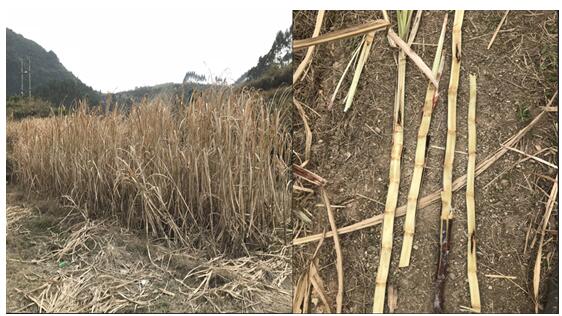 这三张也是柳州市洛满蔗区的受灾情况,而这一块地笔者在上一次笔者并没有发现蔗区受灾,此次这一片蔗叶已经是受灾变枯白,笔者剖开蔗径,发现侧芽已经死,生长点和心叶也已经死,生长点以下4-5节呈水煮状,不过并没有全茎都呈现水煮状,蔗蔸的蔗芽也稍微受灾,从底部往上七节呈现水煮状,一些刚刚生长出来的蔗芽也受到了这次冻害的影响,表现为一些刚刚长出的心叶受灾变黑或死亡。这也是属于受灾较为严重的情况。笔者测的甘蔗平均锤度只有20.3%。