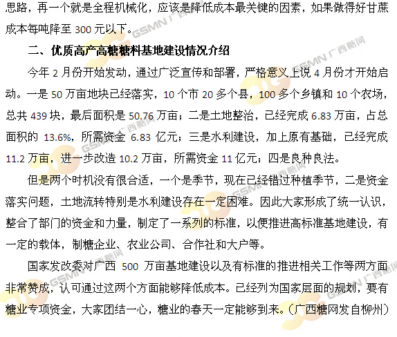 广西糖业发展局副局长刘全跃作广西50万亩优质高产高糖糖料基地建设试点工作情况报告