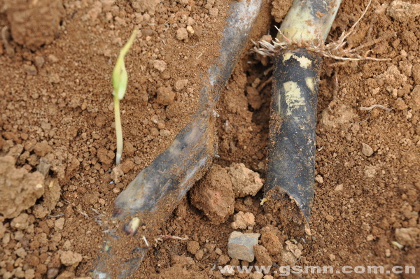 新植蔗:挖开泥土后可以看到蔗种已经发根,但蔗芽尚未长出蔗苗,主要原因是3月份持续了较长时间的低温阴雨寡照天气
