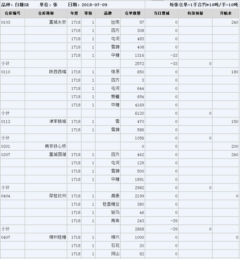 7月9日郑州白糖仓单日报表